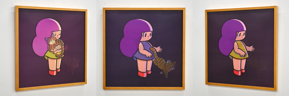 本展のメインビジュアルとなる新作ペインティング「ダンスシリーズ」や、見る角度によって絵柄が変化する大好評のレンチキュラーアニメーションパネルの新作「LOVE SETS US FREE」などを展示販売いたします。 また、メッセージとアートワークがインスタグラム等でも好評のひとことシリーズも過去の名作を展示予定です。